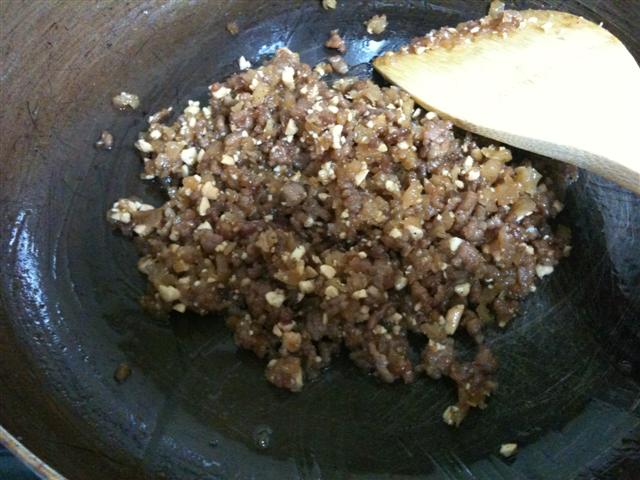 น้ำมันตั้งไฟ ใส่กระเทียมโขลกผัดพอหอม ใส่หมูบด ใส่ไชโป้วหวานหั่น ปรุงรสด้วยน้ำตาลปิ๊บ ซีอิ้วขาว และใส่ถั่วลิสงสุดท้าย
