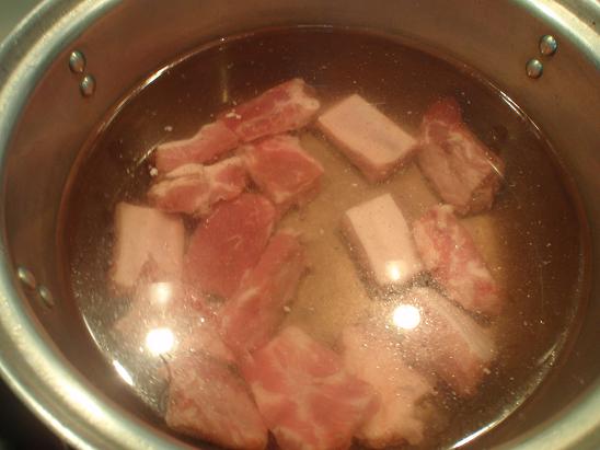 ขั้นแรก ..... ล้างกระดูกหมูให้สะอาดก่อน แล้วเรียงกระดูกหมูวางลงในหม้อเลย