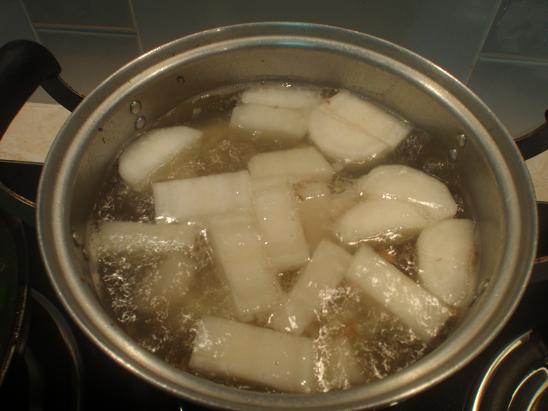 หัวไชเท้าปอกเปลือก ล้างให้สะอาดแล้วหั่นเป็นชิ้นๆ แช่น้ำไว้