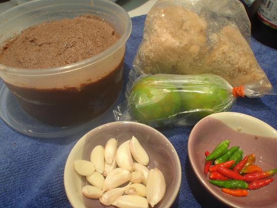 มีกะปิ น้ำตาลปี๊บ พริกขี้หนู มะนาว กระเทียม