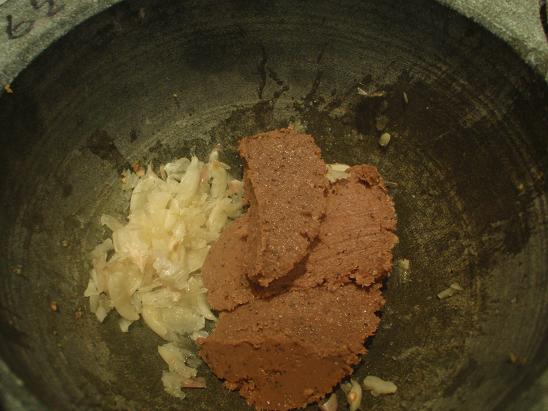 ตักใส่ลงไปในครกประมาณ 2 ช้อนกลาง แล้วก็ตำกะปิกับกระเทียมให้เข้ากัน