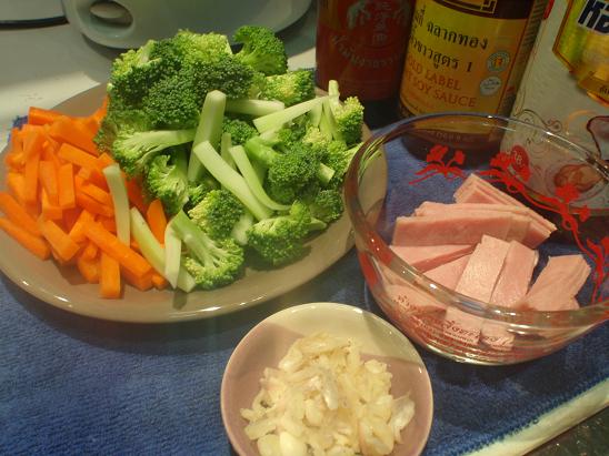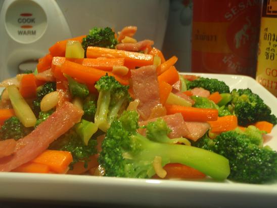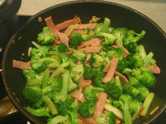 ตามด้วยแฮมลงไปผัดให้สุก แล้วก็ใส่บลอคโคลี่ลงผัด