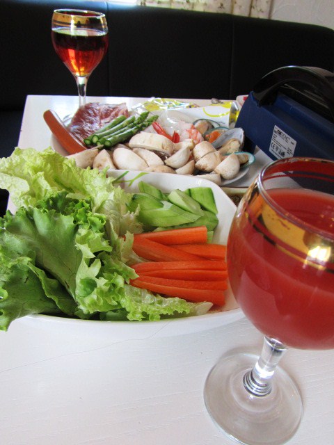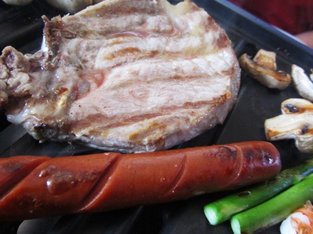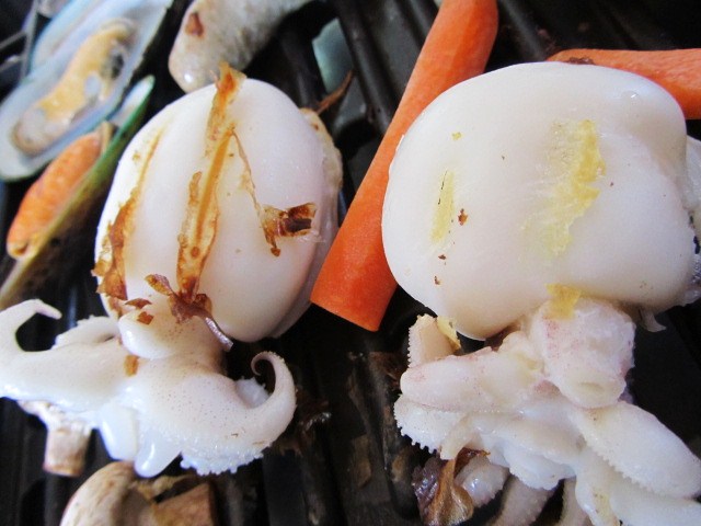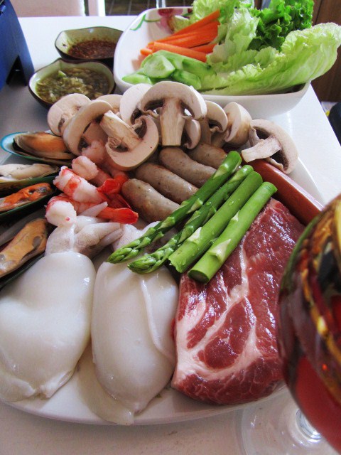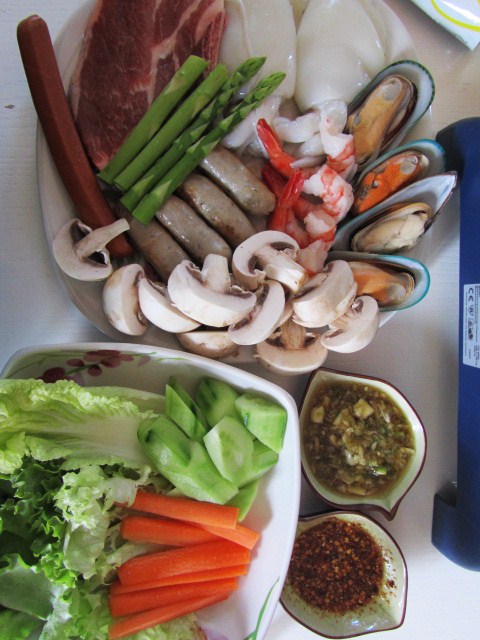 ของที่มีในตู้เย็นที่หาได้ ไส้กรอกหมู ฮอทด็อก หอยแมลงภู่นิวซีแลนด์ ปลาหมึก กุ้ง เนื้อคอหมู นำมาอย่างละนิดหน่อย กลัวกินไม่หมด