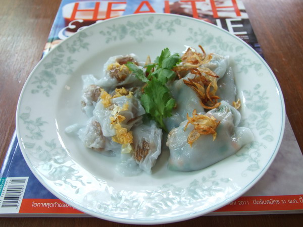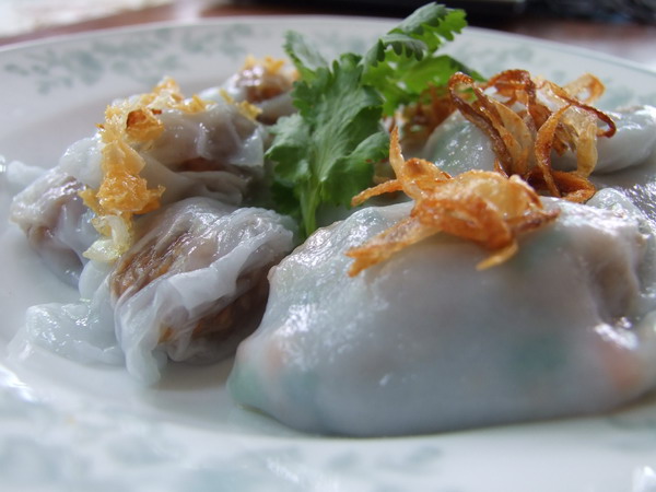 ตั้ง ไฟให้เดือด ใช้ทัพพีตักแป้งละเลงให้เป็นแผ่นกลม ปิดฝากะพอแป้งสุก เปิดฝา ตักไส้ใส่ตรงกลาง พับสี่ทบ ตักขึ้น พรมด้วยกระเทียมเจียว 6. จัดใส่จาน รับประทานกับผักกาดหอม ผักชี พริกขี้หนูสด
